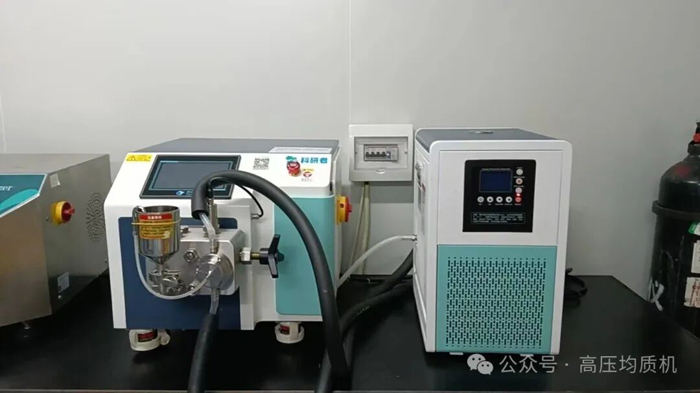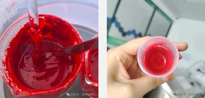 啟動(dòng)設(shè)備,物料在高壓下被均質(zhì),流出后即可觀察到質(zhì)地變得絲滑、色澤均勻亮麗。